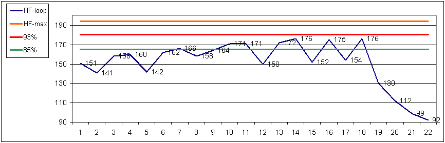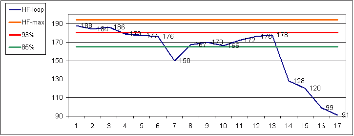 27-01-2008 Gisteren een testje gedaan bij AVTempo. Hartslagmeter omgekregen. Daarna stukken van 200 meter lopen. Tempo /hartslag steeds iets meer opvoeren. Dit om te bepalen waar het omslagpunt van Aeroob/Anaeroob 'zit'. Na 10 stukken vond ik het niet meer leuk. Ik had wel door kunnen gaan, maar dan was ik ramkapot geweest. En dat wil ik niet. Na afloop kwam er een grafiek uit de gegevens: Klik [Hier] om de grafiek te bekijken. Nog even in de kantine nabesproken en wat verder gedacht en gepraat over voetplaatsing & contacttijd, afzet & pendel en energiesystemen. Was leuk! Ook gesproken met één van de trainsters en wat mensen uit haar groep. Het bleek dat de mensen die een stukje Skinning doen ter aanvulling van hun looptraining bij de club last kregen van hun kuiten! NIET GOED!! Wederom benadrukt: luister naar je lichaam!! Vanmorgen weer gelopen met meefietsende Manon. LEUK! Ook wel lastig. Want je wilt toch wat praten. En dat komt bij mij mijn ademhaling niet altijd ten goede. :-) Hoewel ik helemaal geen zin had, toch van start gegaan. Iets langzamer dan de afgelopen weken. En ook door het gesprekje met Henny gisteren. Het voelde wel allemaal goed. Lopen ging best lekker, maar ik heb wel een lager tempo gehanteerd dan de afgelopen keren. Netjes overgestoken en teruggekeerd op het 'Halfway'-call-out en bij terugkomst nog 50 meter extra gelopen: dus een prima balans tussen de heen- en de terugweg. Zojuist even op de kaart gekeken: 4,58 KM. |